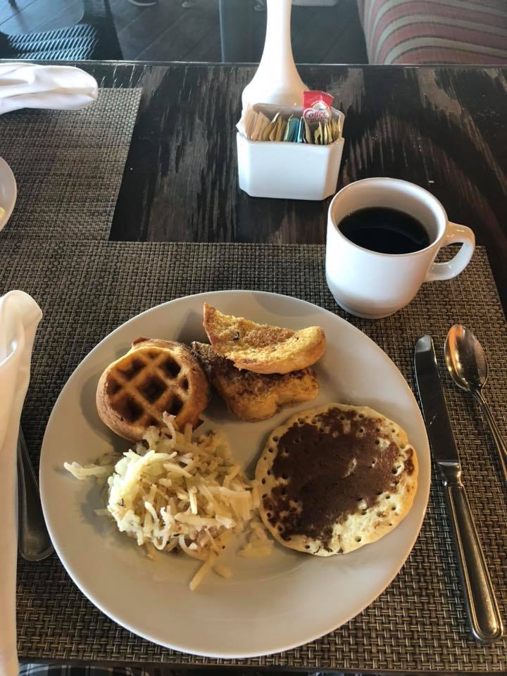 Breakfast included pancakes, hashbrowns, eggs, tea/coffee, juices, etc.